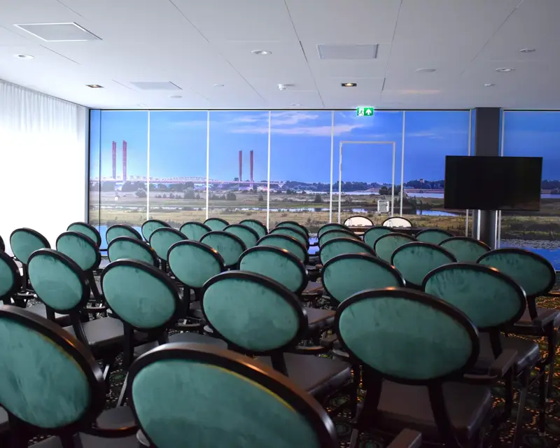 Die Maaszaal verfügt über eine bewegliche Trennwand. Dadurch entstehen ein Hauptraum (117 m²) und ein Nebenraum (70 m²). Der Hauptraum ist über den Nebenraum erreichbar, in dem sich auch die Bar und der Break-out-Bereich befinden. Damit eignet sich der Nebenraum perfekt für Empfänge, Pausen oder einen privaten Umtrunk.