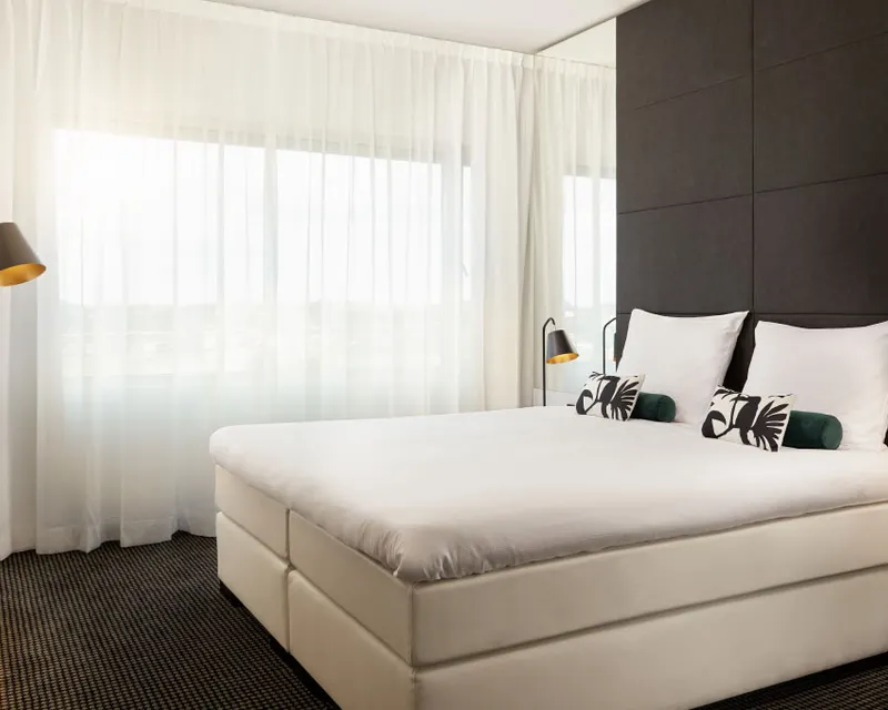 The compact room has a size of 20 m2 and is decorated with a three-quarter bed of 1.20m, a desk, a walk-in shower, a sink and a separate toilet. Thanks to the smart room division, you experience extra space and comfort. The box-spring bed ensures a lovely night’s rest and the desk gives room to finish work. This makes this Economy Room perfectly suitable for short business trips for one person.