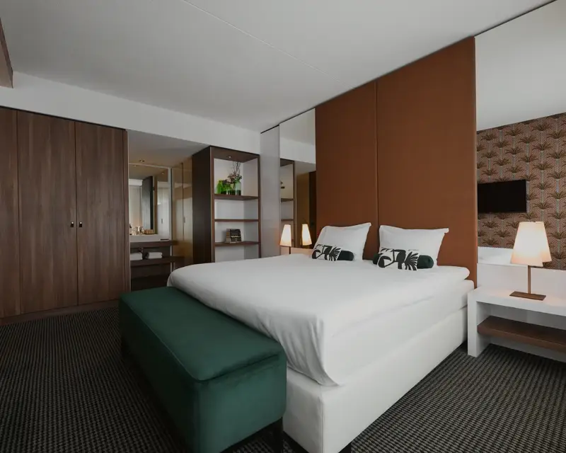 This 40 m2 room has a separate sleeping area with a king-size bed, a desk and a comfortable chair, and a separate bathroom with a double sink, a rain shower and a separate toilet.